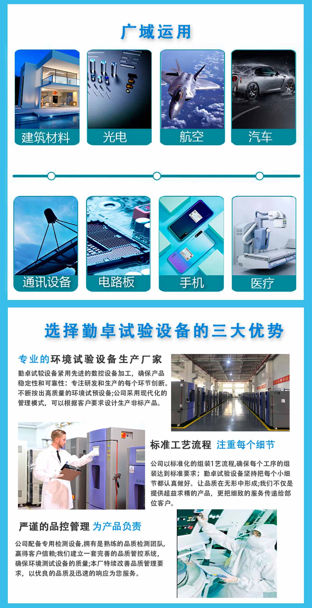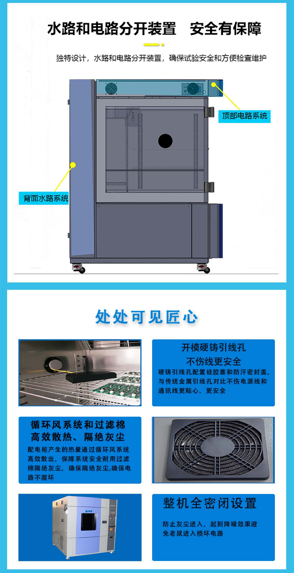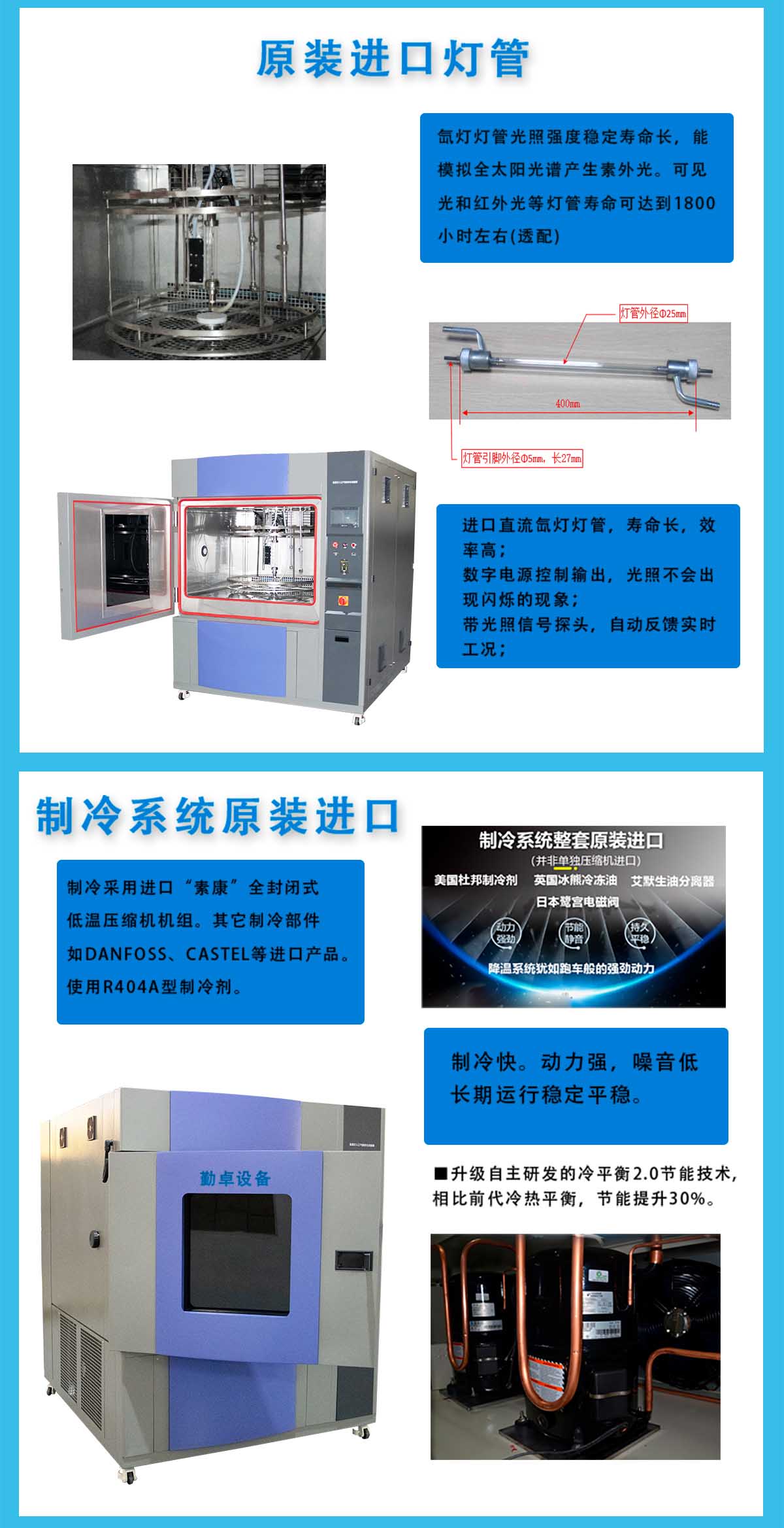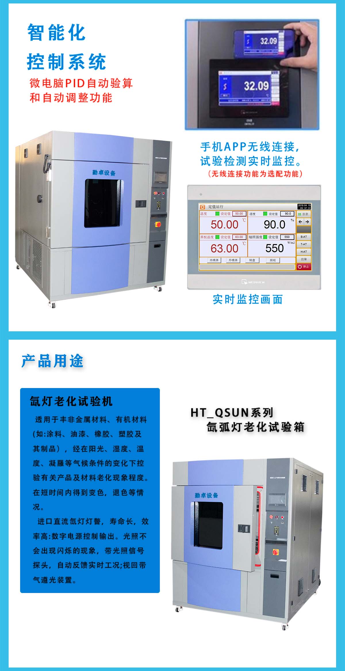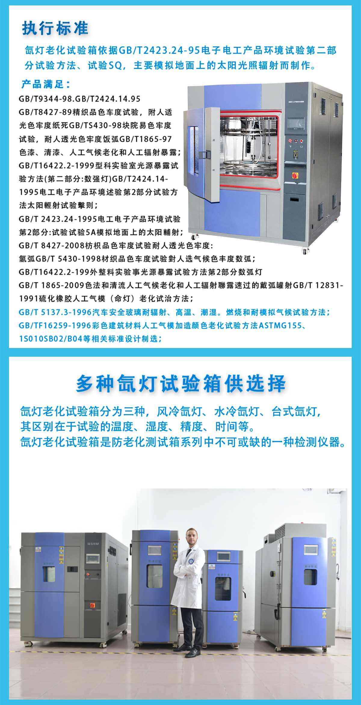 氙灯耐候试验箱模拟造成材料老化的主要因素是阳光和潮湿,耐气候试验机可以模拟由阳光,雨水和露水造成的害。氙灯耐候试验箱利用氙灯模拟阳光照射的效果,利用冷凝湿气模拟雨水和露水,被测材料放置在一定温度下的光照和潮气交替的循环程序中进行测试,用数天或数周的时间即可重现户外数月乃至数年出现的危害,人工加速老化试验数据可以帮助选择新材料,改良现有材料,以及评价配方的变化是如何影响产品的耐久性的。